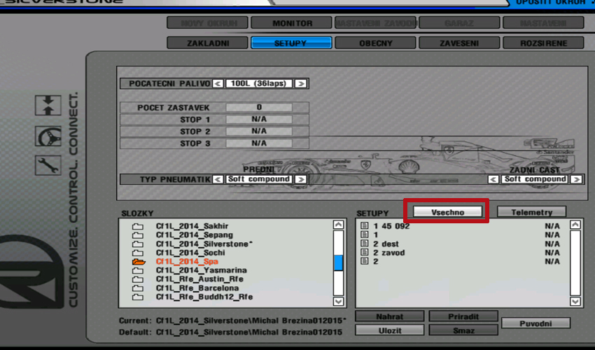 Je to vlastně stejné jako při přihlášení offline. Vaše auto bude v garáži a nabídka je naprosto totožná s režimem testování. Jediné co by vám mohlo dělat potíže je, že pokud vám nějaký zkušený závodník pošle svůj set na vyzkoušení tak tento set nebudete moci najít. Tento set můžete načíst když pujdete do Garaže a Setupy a pak si nad levým polem budete muset kliknout na políčko Vuz a to se změní na Vsechno. Pokud to tak máte tak můžete jít do pravého pole a tam pod názvem Doporuceno bude set co vám váš kolega poslal. Pozor tento si musíte uložit do své složky ze závodu jinak po odpojení z tratě o tento set přijdete.