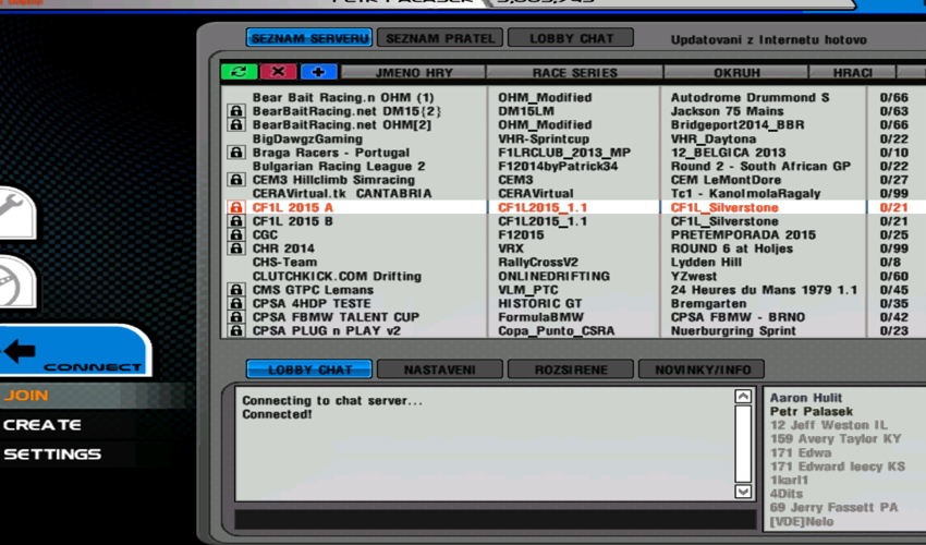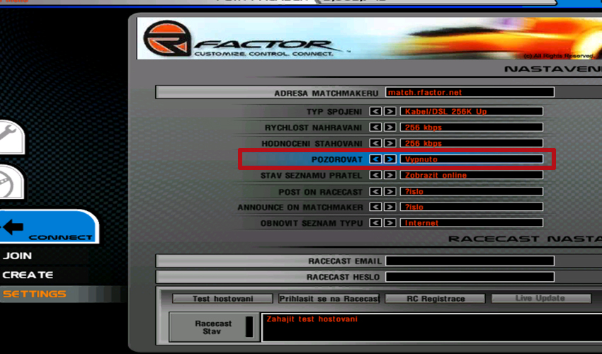 Na server se můžete přihlásit i jako takzvaný pozorovatel. Nebudete mít auto a nebudete moci vyjet na trať, ale uvidíte a uslyšíte vše co se na trati děje. Stačí jen v Connect a settings změnit v položce Pozorovatel na zapnuto. Toto je doporučeno pro maršály závodů. Aby nezatěžovali tolik server. Pozor! Když budete chtít opět na trať s autem tak se opět přepněte na vypnuto.