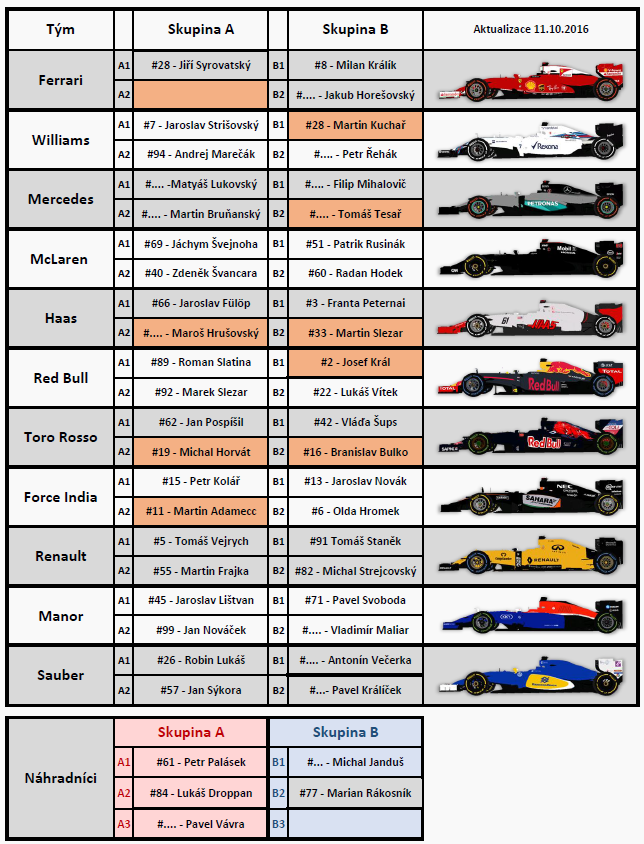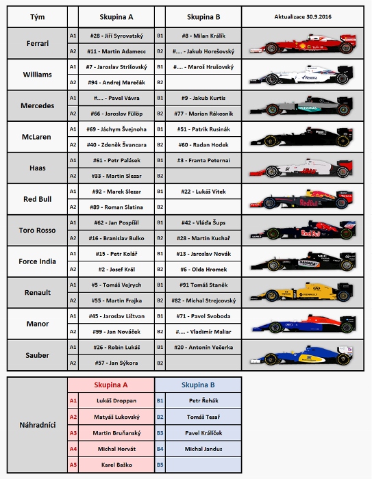 Po přidělení všech bonusových bodů (body za práci na lize, admin hodnocení, potřeby ligy, za účast i výsledky, aj. ) byl stanoven koeficient a sestaven žebříček. Podle něj jsem několik jezdců oslovil a dle jejich vyjádření je možné skupinu A sestavit. Zajímavostí je, že volný tým pro náhradníky a kvalifikanty bude jeden z běžných týmů, protože tým ČF1L bude trvale obsazen dvojicí náhradníků Hrušovský – Palásek. Oba jezdci se nezúčastní několika závodů, hlavně z pracovních důvodů. Navíc oba jako admini ligy budou mít i jiné, například příprava nového módu, zabezpečení webu, serverů, nové počasí, aj.