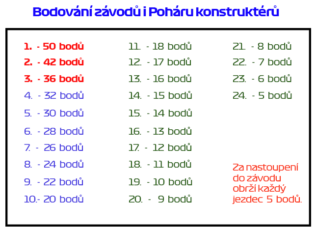 • Pohár konstruktérů : sčítají se body kmenových jezdců, získané v obou skupinách stejného týmu.